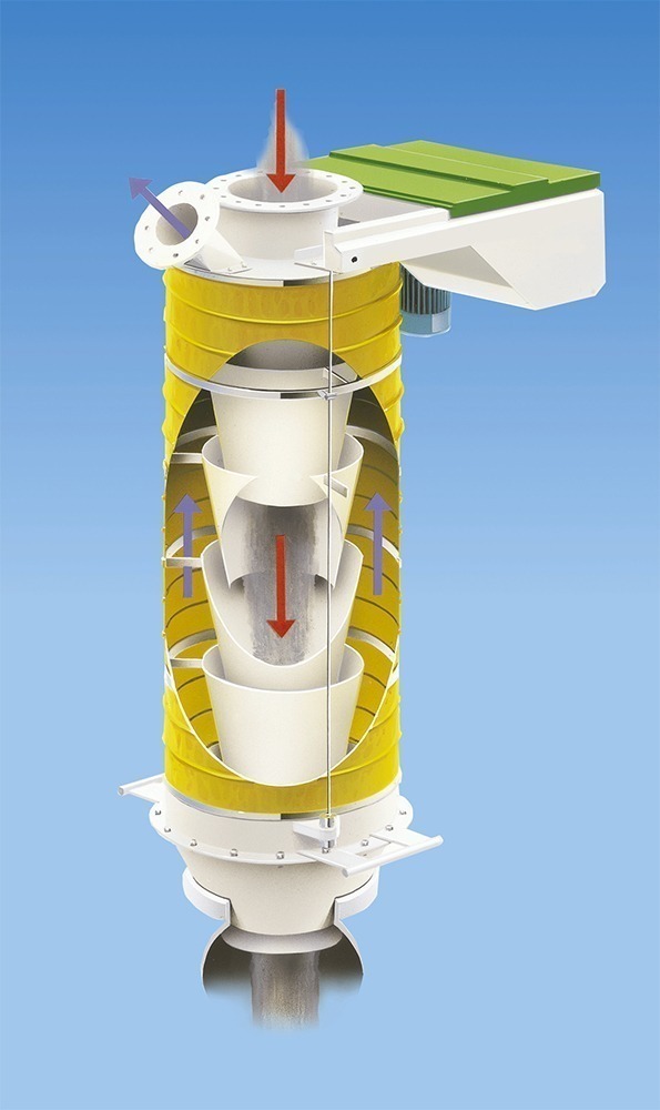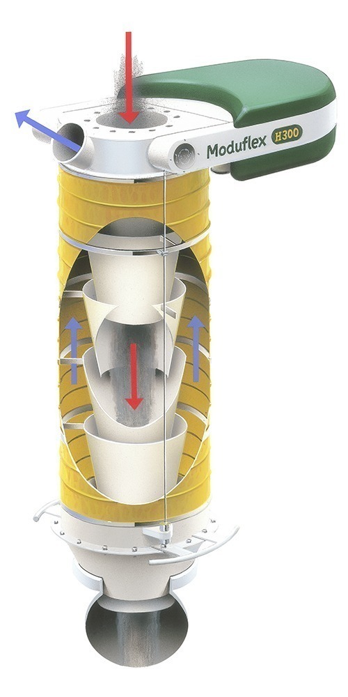 - Der Materialstrom fließt in freiem Fall durch die innenliegenden Führungskonen